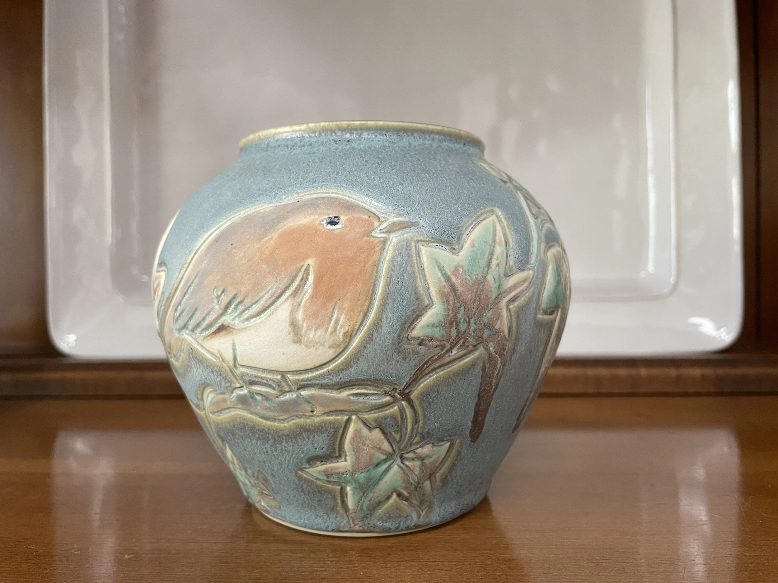 On my mantel sits a short, stout vase, just over four inches tall and colored with a muted green-blue glaze. On this background is etched and painted a robin with a tinge of red, along with several ivy leaves, green and brown, hanging off a branch.